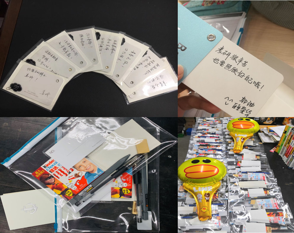 院员工会的学弟学妹们精心准备了考研加油包,包括透明笔袋、签字笔、橡皮、涂卡笔、用于补充体力的巧克力和师生亲笔书写的祝福卡片,预祝各位考研员工“圆梦考研”。活动中,老师们叮嘱考研学子稳定心态、注意身体,争取以最好的状态迎接考试。学弟学妹们向他们比一个加油的手势,送一个温暖的拥抱。“青春无悔,回忆很美”、“人生没有白走的路,每一步都算数”等鼓励的话语深深地感动了考研学子,他们感受到了来自学院的暖暖关心和殷殷期盼。希望公司考研学子保持良好的状态,一路披荆斩棘,为艰辛的考研之路画上圆满的句号。