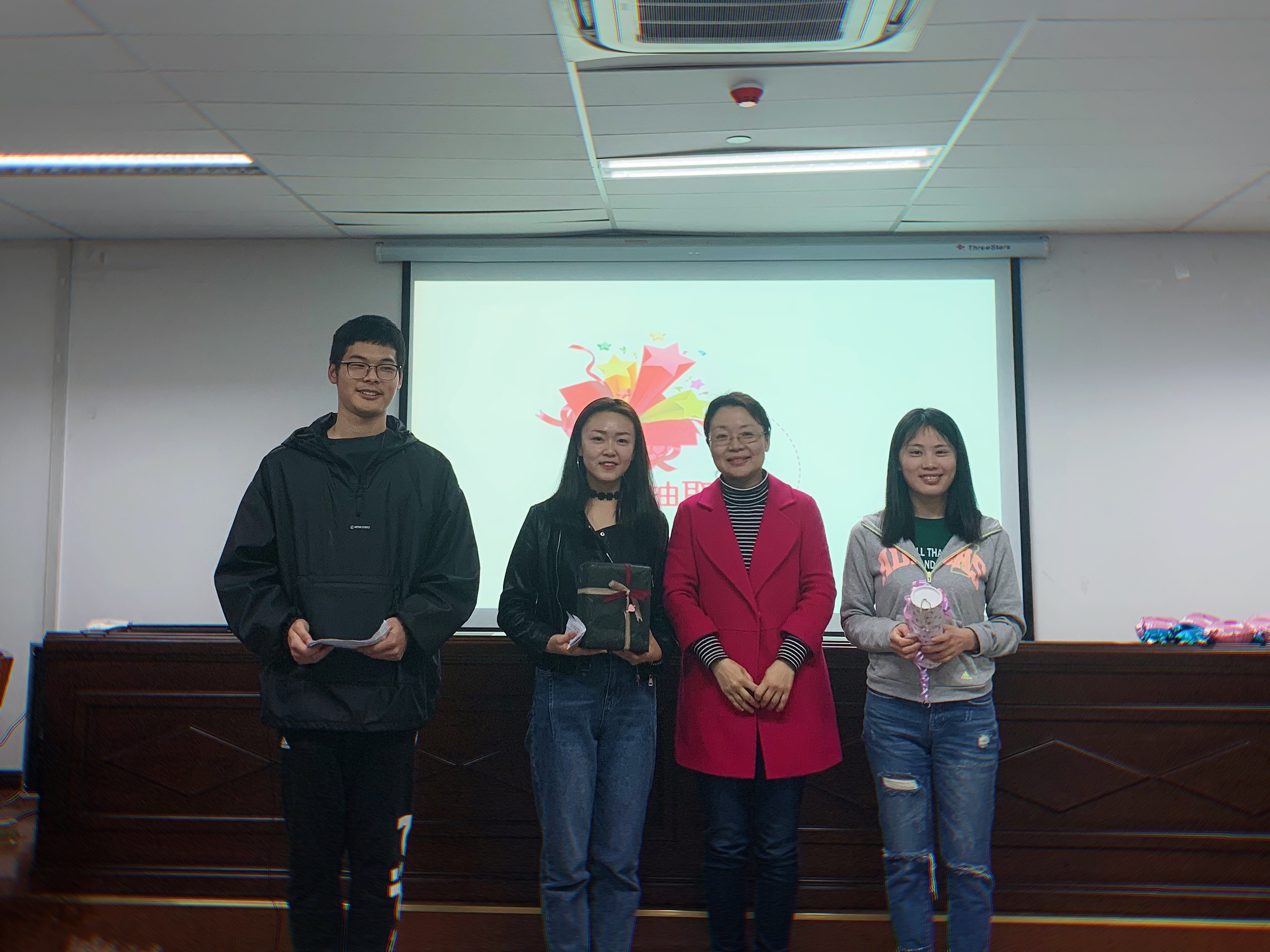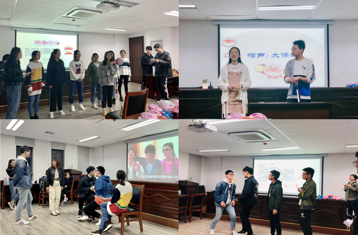 1830分,教九楼9A404传来了欢快的开场音乐和阵阵欢呼,现场的观众手中挥舞着小猪佩奇的气球,同身边的伙伴分享着快乐。第一个活动“筷子接力赛”拉开了晚会的序幕,参与的员工在嘴中衔着一根筷子,将一只小黄鸡通过接力传向终点,大或仰面、或俯首,相互之间紧密合作,力争胜利。看着参与者前仰后合、手舞足蹈的样子,观众们被逗得捧腹大笑的同时感受到了团队合作的力量。在“听歌识曲”环节,“文艺骨干”们为争夺最后的胜利,使出浑身解数去抢夺摇铃,期间更是唱出了《醉赤壁》等多首脍炙人口的歌曲,引发全场的合唱,在熟悉的歌声和温馨的氛围中,大家仿佛穿越回了曾经的时光,想起了那些快乐的事和温暖的人。