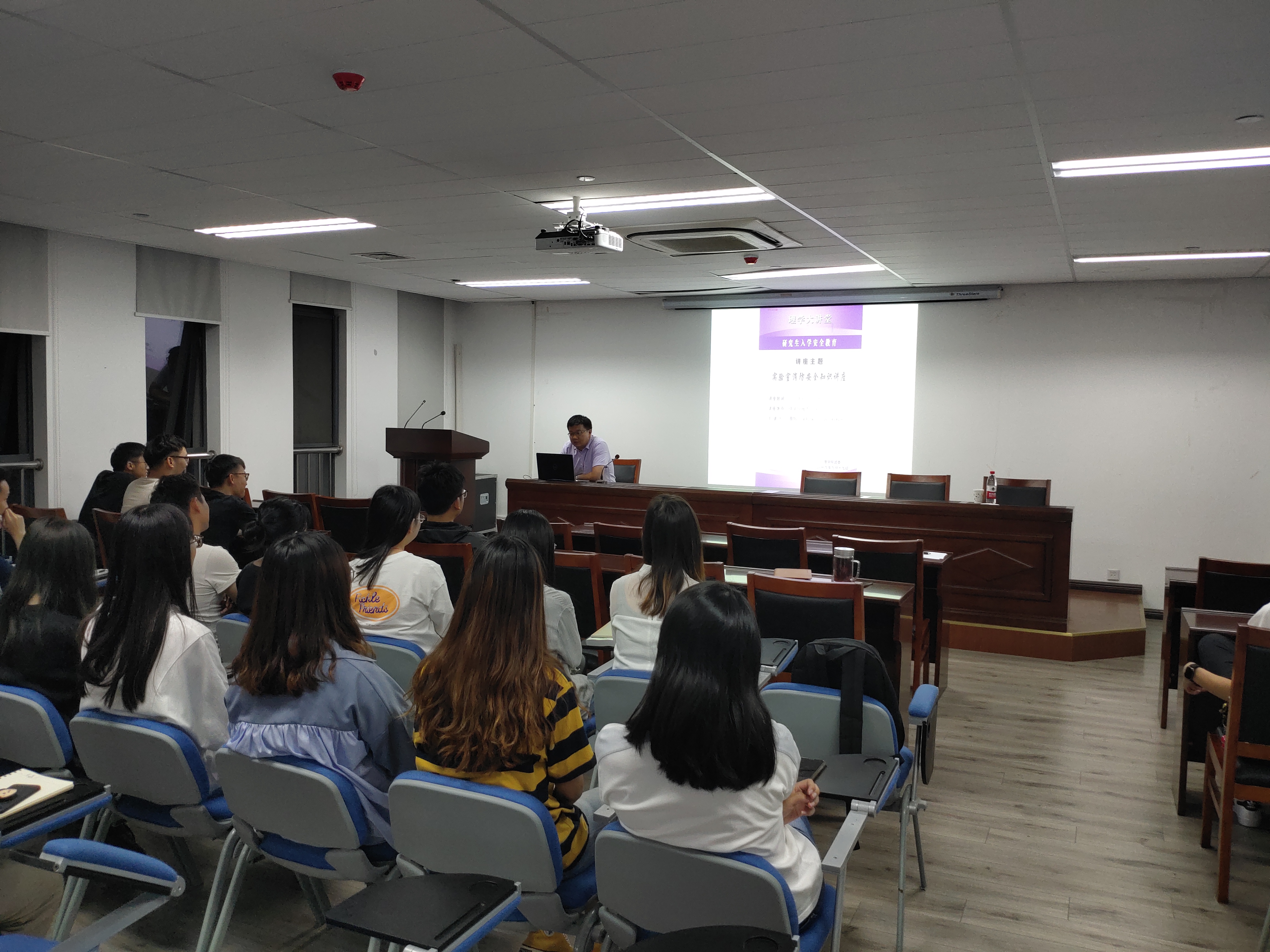 9月23日晚,公司在9A404报告厅组织了2019级研究生消防安全专题教育讲座,全体2019级硕士研究生参加了本次讲座。此次邀请了公司保卫处消防安全科曹牧科长给同学们做了题为“实验室消防安全知识”的专题讲座,讲座由研究生辅导员楼扬老师主持。
