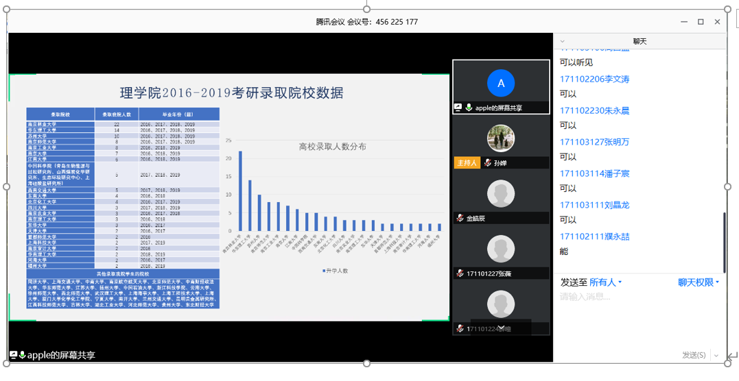 为在疫情防控期间进一步加强学风建设,营造良好的考研学习氛围,4月10日下午,学院以“坚定信念、成就梦想”为主题组织召开了线上“2017级年级大会——考研动员暨学风建设专场”。公司党委副书记副经理姜琪、2017级辅导员孙婵、三位研究生学长学姐和2017级全体员工参加了线上会议,会议由孙婵老师主持。