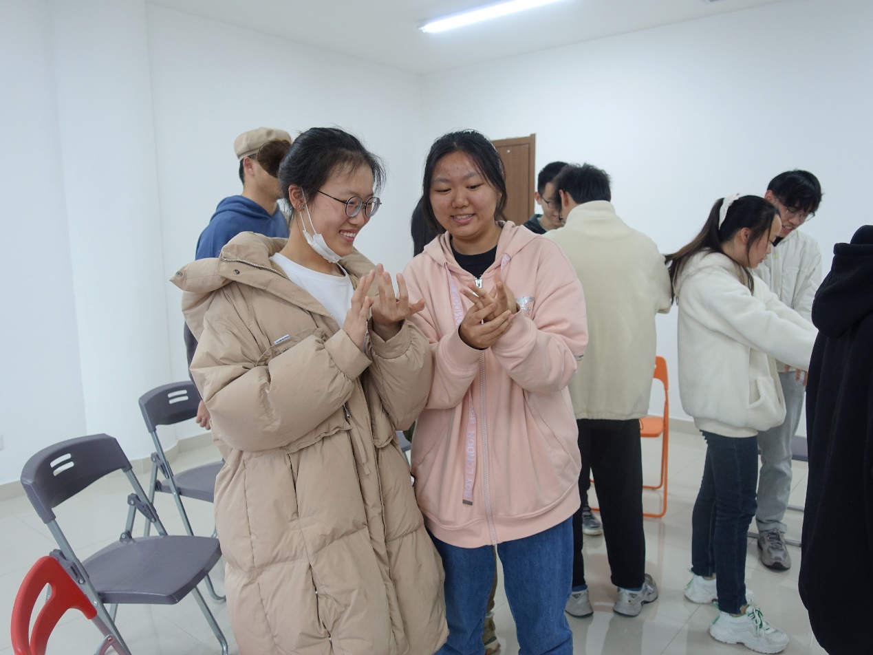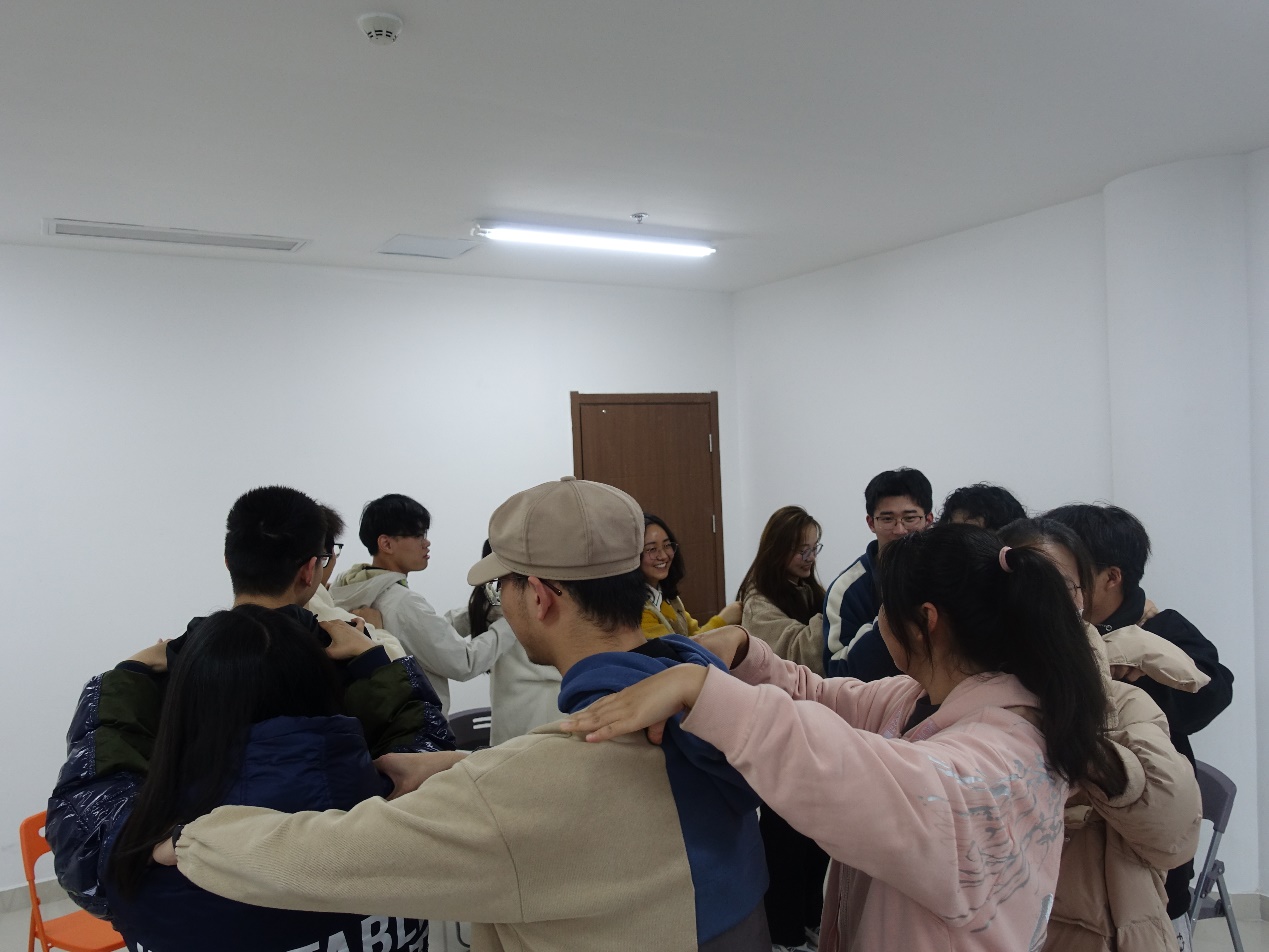 活动开始前,吉老师首先与大家共同签订了团辅协议,约定以保密、真诚、尊重、理解的原则参与到此次活动中来。为了让不熟悉的大家能够彼此认识,活动开始首先进行了握手认识环节,员工两两一组进行握手和自我介绍,然后进行石头剪刀布的PK,赢的人为龙头继续寻找伙伴,输的人为龙尾依次坐下,直至所有人都围坐成一个大圈,再通过相互捶背捏肩的活动来让大家放松身心,拉进距离。活动的第二个环节是相互模仿,报数分组后大圈分为了内外两个小圈,首先由内圈的人做动作、外圈的人观察模仿,然后交换。这个环节让员工之间密切互动,一些复杂有趣的动作也使气氛更加活跃。第三个环节中,内圈和外圈分别成为两组,组内的同学相互交流,进行"滚雪球"式自我介绍,从第一位同学开始依次介绍自己的名字和家乡,并做一个专属动作结尾,小组的最后一个成员将所有组员的介绍串联起来向大家展示。