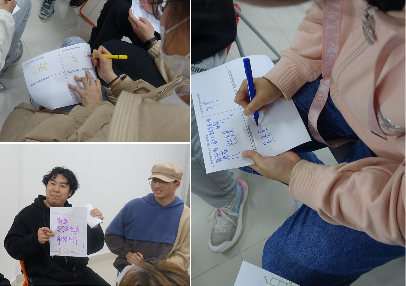 经过几个轻松欢快的热身活动,接下来进入了四宫格作画环节。每人先完成四宫格中的前3个部分,用图画呈现出自己目前所处的宿舍人际环境、让自己觉得有压力的宿舍人际情境和自己认为可以解决问题的措施,然后进行组内讨论,大家集思广益帮忙解决宿舍问题,并完成图4,展现问题解决后的宿舍状态。在个人的四宫格完成后,每人执一种颜色的笔,在白纸上一人一笔,画出本组成员心目中的理想宿舍,并在大组内分享。在作画的过程中,各位宿舍心理信息员交流讨论着宿舍生活中遇到的各种问题,相互支招,希望通过大家的共同努力让宿舍的生活环境和人际关系都能越来越好。