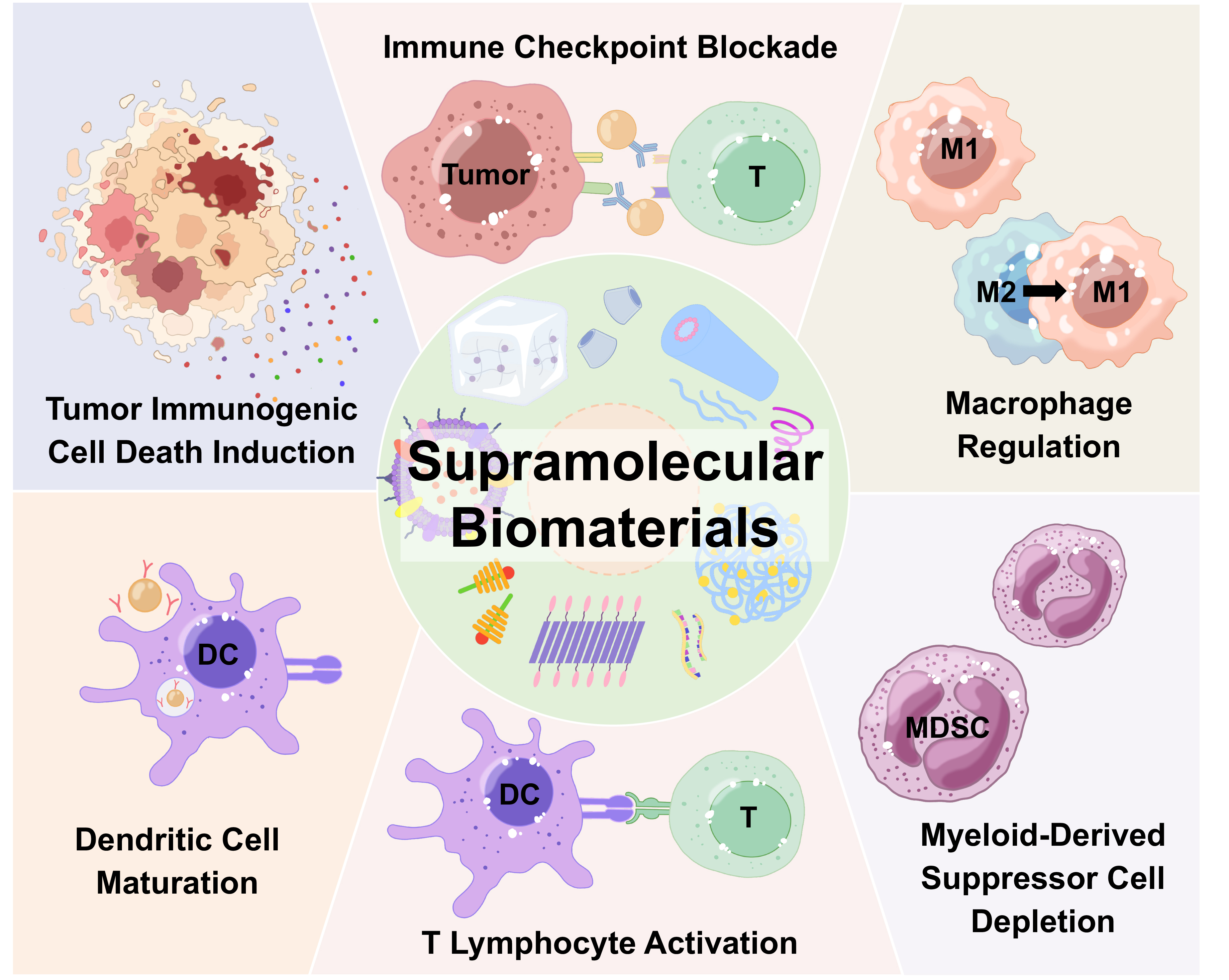 癌症是全球最严重的健康杀手之一,手术、放疗、化疗等传统治疗方法虽然在一定程度上缓解了患者的痛苦,但是由于肿瘤存在复杂的病理性微环境,传统治疗手段仍有巨大的局限性。在当今快速发展的医学领域,纳米医学和材料科学的进步促进了生物功能材料的快速发展。生物功能材料的开发已成为一项引人注目的前沿技术,加速其临床应用为癌症治疗带来了一系列令人兴奋的突破。超分子生物材料表现出高负载效率、优异的生物相容性和多样化的免疫调节活性,为癌症免疫治疗提供了强有力的工具。本文综述了超分子生物材料在肿瘤免疫治疗关键步骤中的重要应用。剖析了肿瘤免疫治疗中的关键科学问题,包括抗原递呈、T淋巴细胞激活、肿瘤相关巨噬细胞调控以及髓源性抑制细胞耗竭等。重点讨论了超分子生物材料的研究进展,及其在免疫治疗领域的应用,并探讨了超分子生物材料在癌症免疫治疗中的局限性和发展前景。