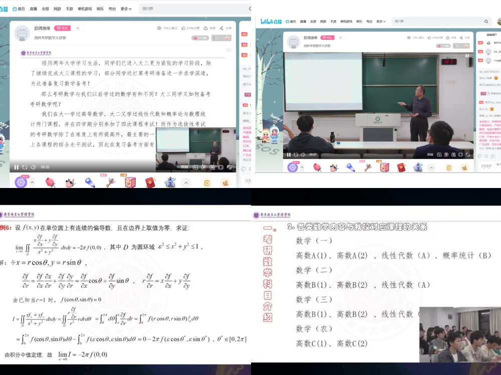 杨明辉老师详细介绍了备考考研数学的方法和技巧,概括了数学考研中高等数学、线性代数和概率论与数理统计这三门课程的知识体系。他强调了考研数学复习中需要下功夫的重点与难点,提醒同学们在备考中一定要有清晰的规划,以实现更高效地备考。随后,杨老师以高等数学为例,通过讲解极限、微分中值定理等知识点的经典例题,阐述了考研数学常见的解题方法和技巧。杨老师的报告获得了师生们多次热烈掌声,线上点赞达到7000多次。