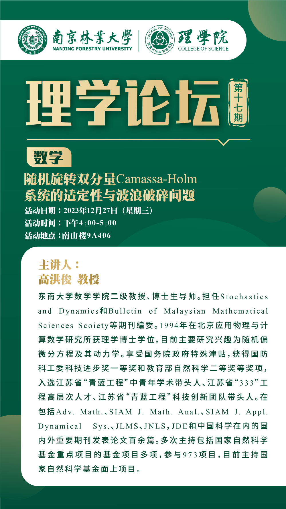 理学论坛第十七期:高洪俊教授(东南大学)