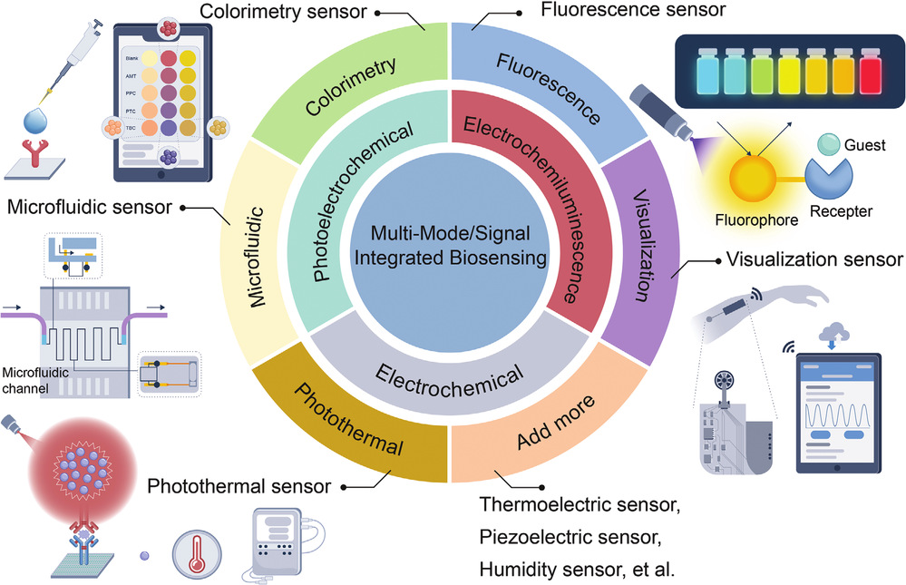 本综述旨在深入探讨电化学(EC)多模式/信号生物传感器的最新进展、潜在应用与挑战。论文背景基于EC技术的高灵敏度、可靠性、成本效益及快速演进,尤其关注其与其他传感技术(如荧光、光热、比色、微流控等)的结合。研究方法包括全面分析多模式/信号传感器在EC传感领域的应用,并探讨其与其他传感技术的整合。研究过程涉及对文献的深入剖析,以及对多模式/信号生物传感器的性能、优势与不足的综合评价。实验部分主要关注多模式/信号生物传感器的设计与实施,以及其在生物分子检测中的性能评估。实验变量包括不同传感模式的组合、信号处理策略等,综述展示了多模式/信号传感在提升检测准确性、降低假阳性/假阴性率方面的优势。综述展望部分指出,多模式/信号生物传感器在EC传感领域具有巨大潜力,但仍需解决一些挑战,如传感器的小型化、集成化及稳定性等。该研究为EC集成多模式/信号生物传感器的未来发展提供了新视角和启示。