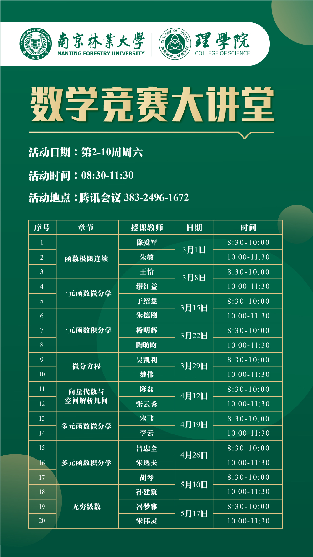 数学竞赛大讲堂(第2-13周每周六 08:30-11:30)