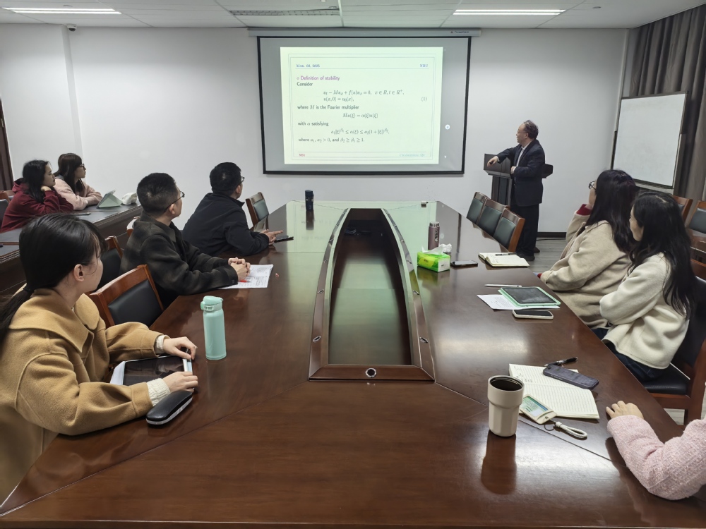 屈教授在报告中主要介绍了可积系统孤子的存在性与一些研究可积系统孤子稳定性的方法,其中可积系统的可积性是研究孤子稳定性的关键。屈教授详细地阐述了如何利用可积性来证明孤子的稳定性,并分享了一些相关的开放性问题,屈教授与到场师生进行了交流互动,对各位师生提出的问题做了详细解答。