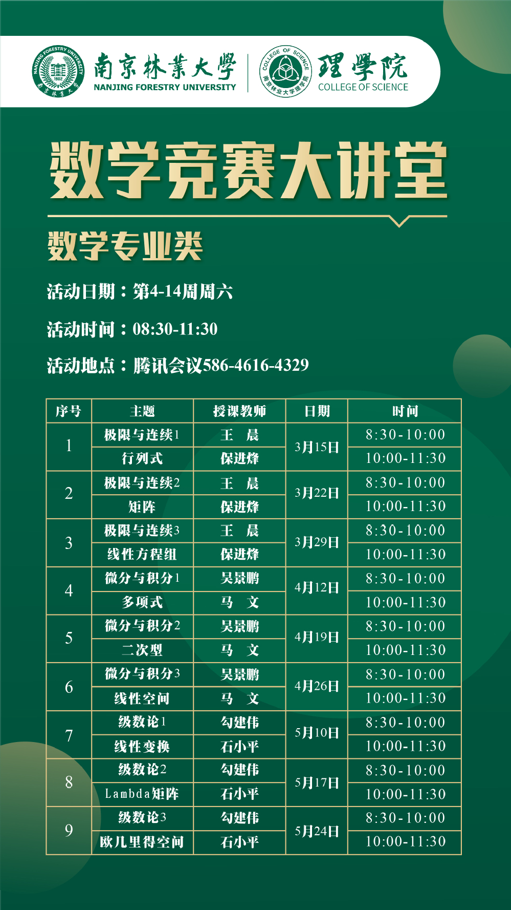 数学竞赛大讲堂(数学专业类,第4-14周周六)