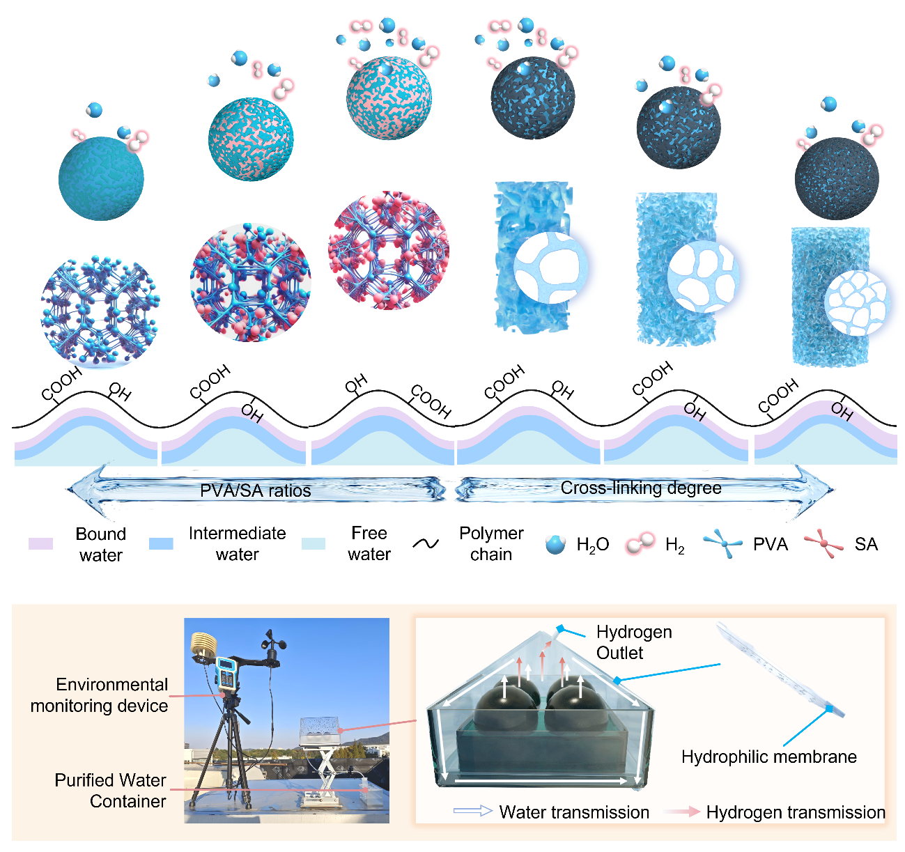 本工作中,研究团队提出了一种新型光热-光催化协同增强的氢-水联产系统构筑策略。该一体化系统以负载有机光催化材料的可漂浮复合水凝胶为核心结构,通过太阳能驱动的光热蒸发在界面区域形成富含松散氢键网络的微环境,提供连续的能量传输和质量传递通道,从而降低反应活化能与界面势垒。在高盐度海水条件下,负载型的新型复合水凝胶展示出超高的太阳能光热水汽蒸发速率、全天候自旋转脱盐效率以及高效稳定的光催化分解水制氢活性,在光热-光催化一体化系统中实现了太阳能驱动的海水淡化与分解水制氢的高效协同。