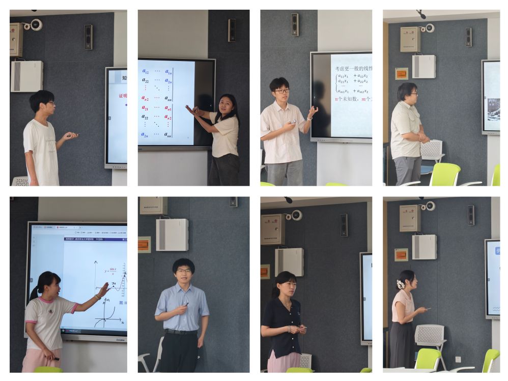罗振扬教授、雷文教授与徐爱军副教授担任评委。九位青年教师积极参赛,紧密围绕课程内容,以生动的表达、丰富的案例与现代教学手段,深入浅出地解析专业知识,充分展现了扎实的教学功底与创新的教学思维。其中吴凯利老师的《高等数学》从实际应用案例出发,让员工逐步理解了曲率的定义,并通过曲率在高铁上的应用引出课程思政,培养了员工爱国主义情操与民族自豪感;吴藏老师的《环同态的应用—中国剩余定理》以“历史—抽象—应用”三维教学为主线,逻辑顺畅,层层递进,获得了良好的课堂反响。其他各位老师分别从不同的课程角度进行了讲授,均获得不错的课堂效果。近两年新入职的教师也到场观摩学习。