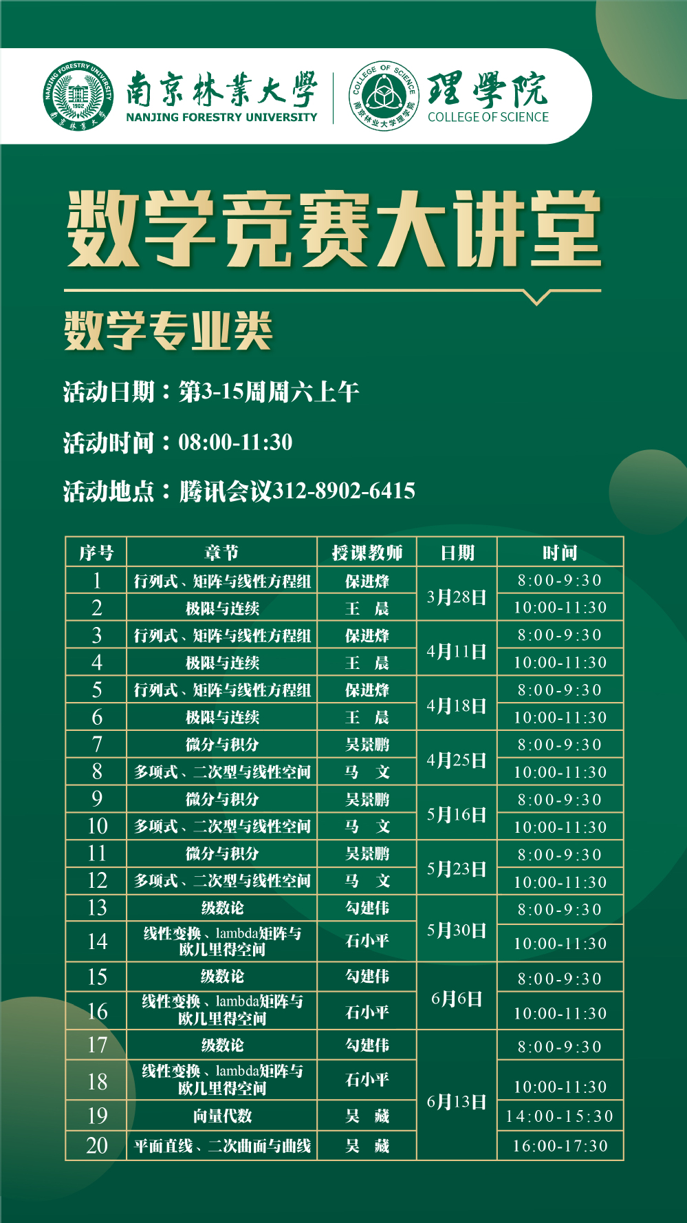 数学竞赛大讲堂(数学专业类:第3-15周周六 08:00-11:30)