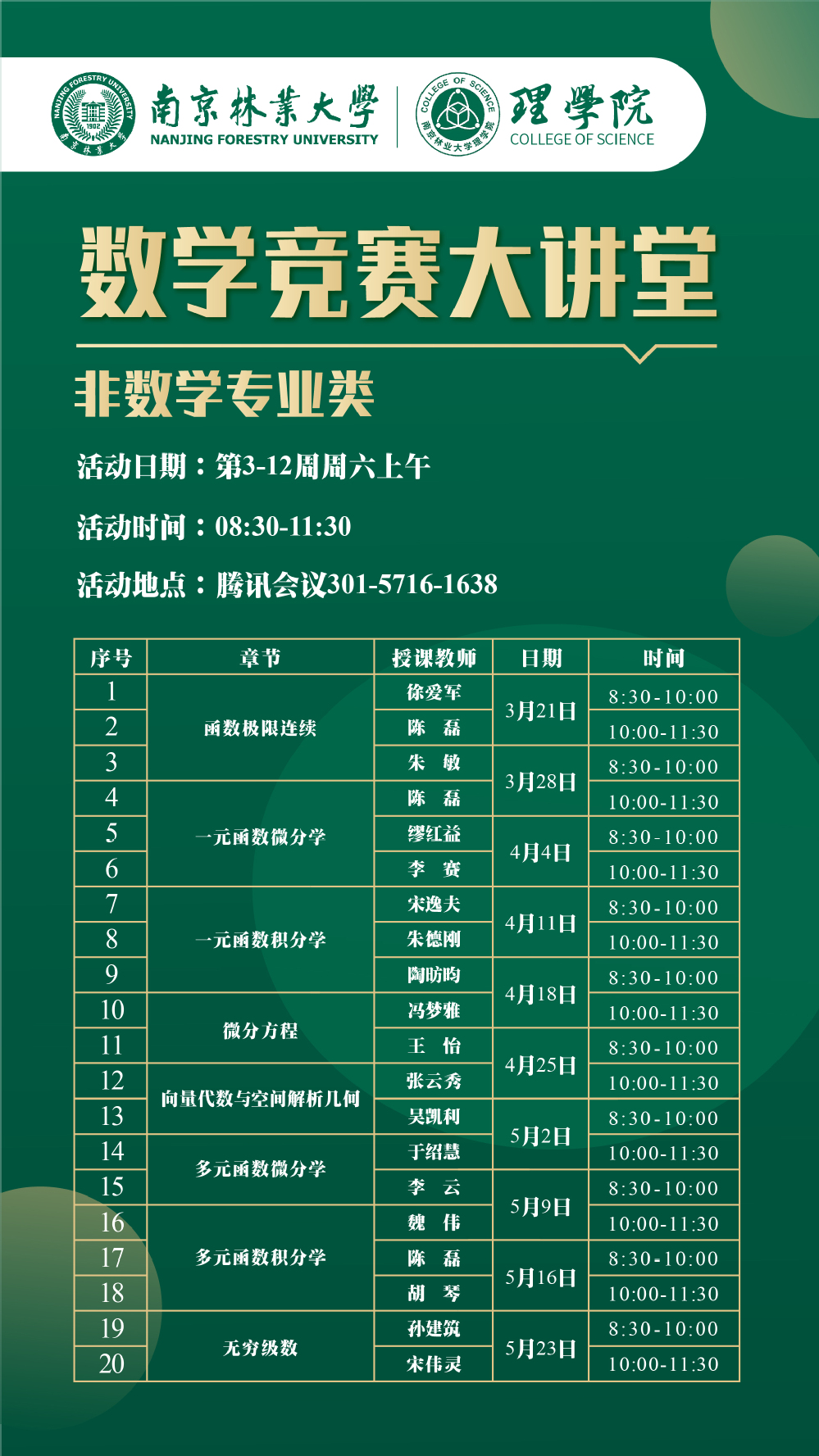 数学竞赛大讲堂(非数学专业类:第3-12周周六 08:30-11:30)